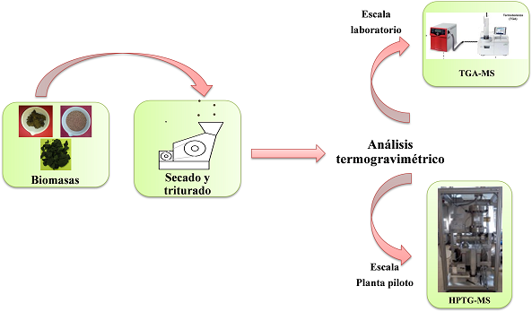 Para llevar a cabo este objetivo, se plantea el uso de la técnica experimental de termogravimetría acoplada a un espectrómetro de masas (TGA-MS). Esta técnica permite evaluar la pérdida de peso que sufre la biomasa y los compuestos que se generan durante la conversión termoquímica de la misma con el tiempo. Con esta técnica se pueden establecer métodos cuantitativos para la determinación de parámetros cinéticos, establecimiento de condiciones óptimas de operación e identificación de compuestos nocivos en los gases efluentes. En definitiva, a partir de los datos experimentales se pueden desarrollar modelos que permiten la mejora de los procesos de conversión de biomasa en energía y su integración con otros.