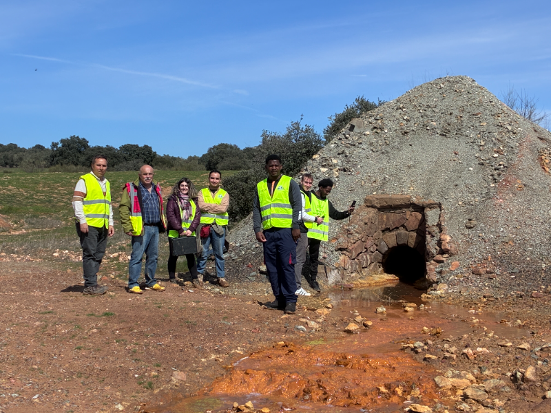 El grupo en la boca de la galería de drenaje de la escombrera de San Quintín Este. De izquierda a derecha: Luis Aguirre (TRAGSA); Juan Vicente Campillo (GEACAM/JCCM), Nerea García-Donas, Óscar Ávalos, Feliciano Bacale, Théo Soury-Gauthier, y Ricardo Buele.