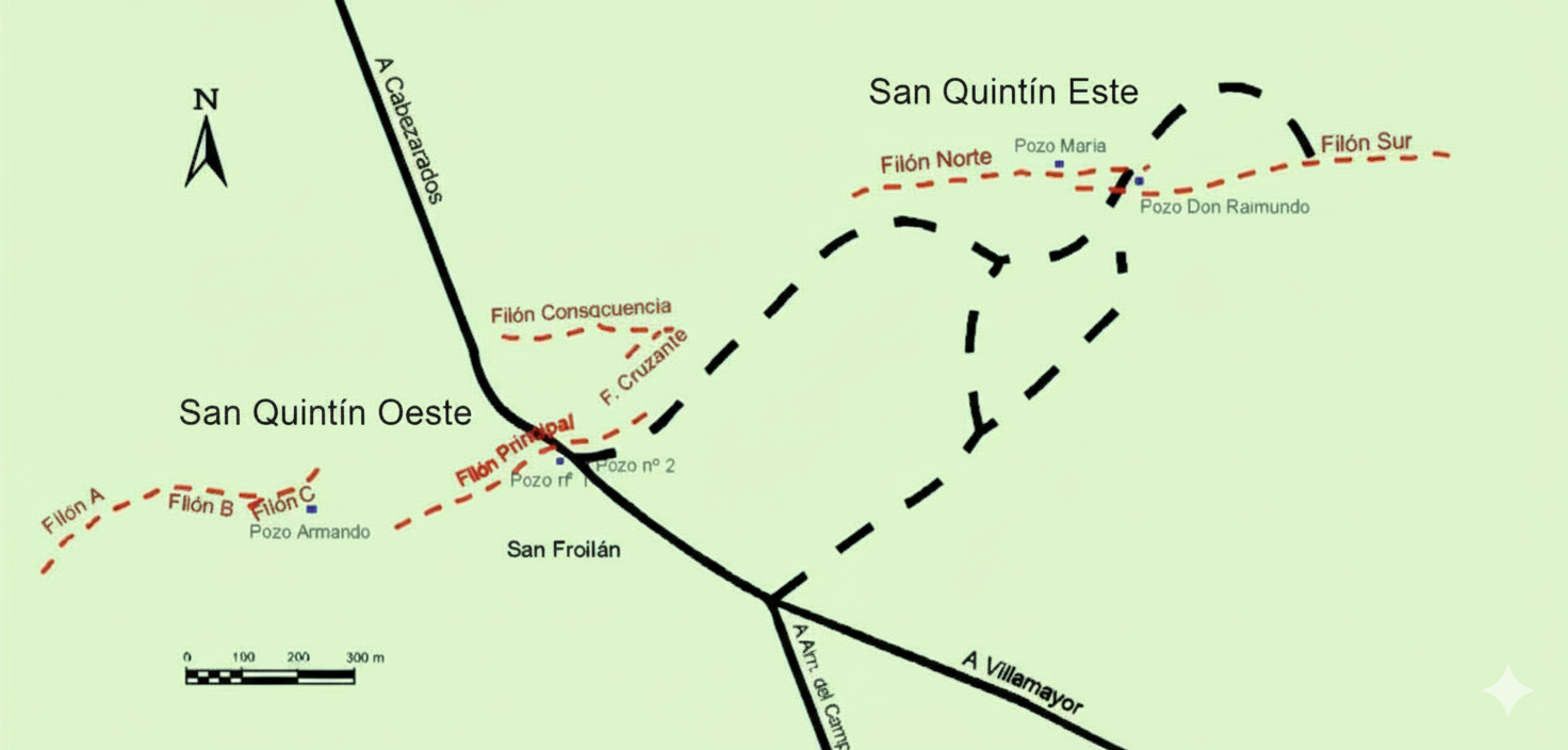 El grupo minero está separado en dos sectores: San Quintín Este, donde se explotaron los filones Norte y Sur, mediante los pozos Don Raimundo y María, y San Quintín Oeste, en el que se explotaron los filones A, BC, Principal, Consecuencia y Cruzante.