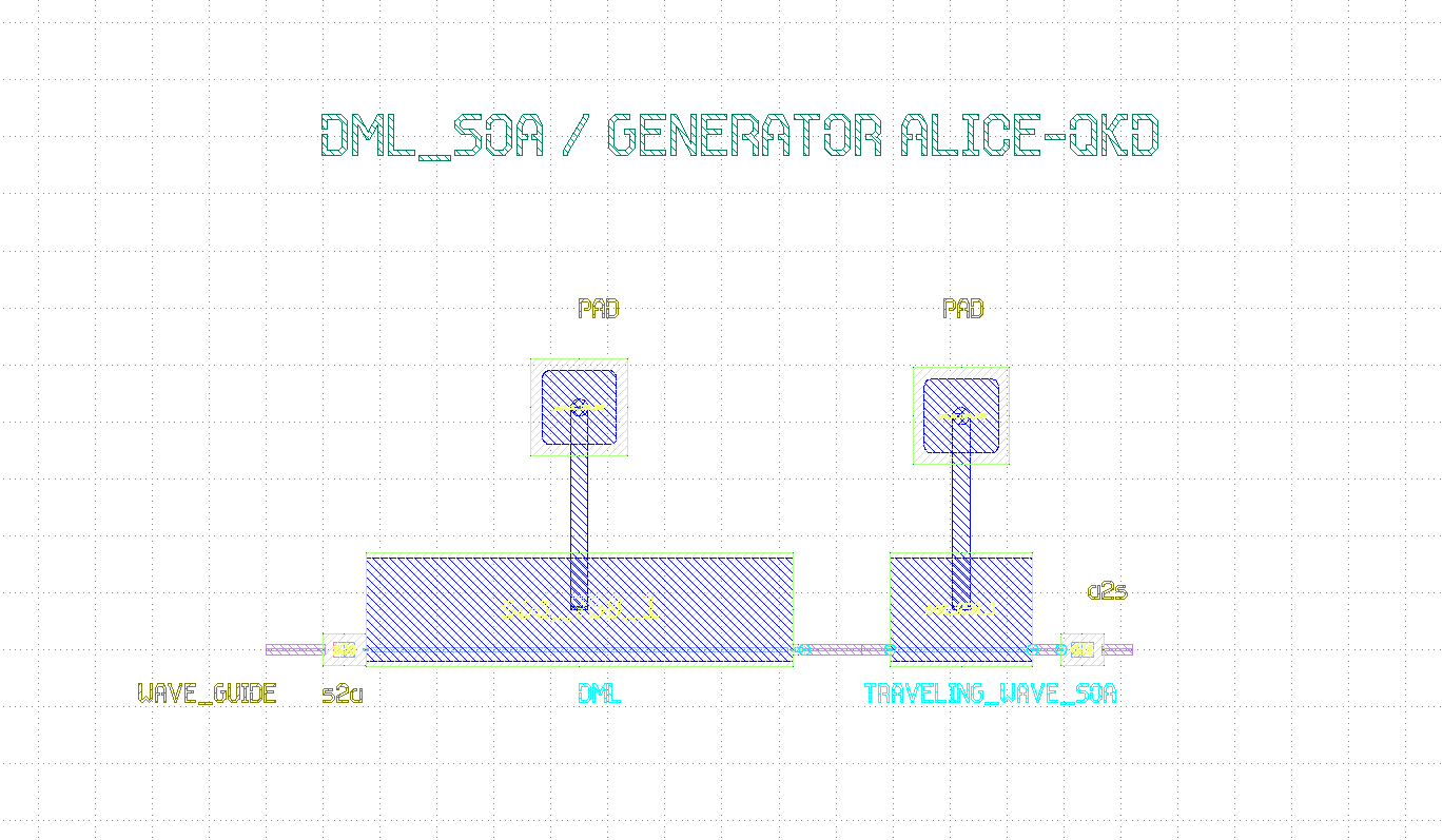 El diseño de los PICs se ha centrado en representar de manera fiel los componentes fundamentales de los emisores cuánticos. Se han desarrollado distintos modelos, incluyendo un DML, un VCSEL-MZM y un sistema DML+SOA bajo OIL. Cada uno de estos diseños se ha representado gráficamente y descrito con detalle, buscando el compromiso entre precisión en la simulación y viabilidad práctica de fabricación.