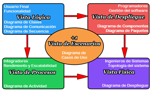 Estas 4 vista las denominó Kruchten como: vista lógica, vista de procesos, vista de despliegue y vista física y la vista “+1″, que tiene la función de relacionar las 4 vistas citadas, la denomino vista de escenarios.
