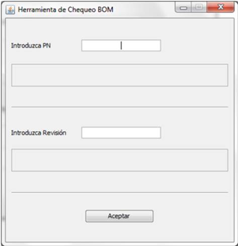 – Ventana inicio (PN y Revisión). La primera consiste en una pantalla inicial, donde el ingeniero debe introducir los datos, PN y revisión, que servirán para identificar toda la información que se va a analizar.