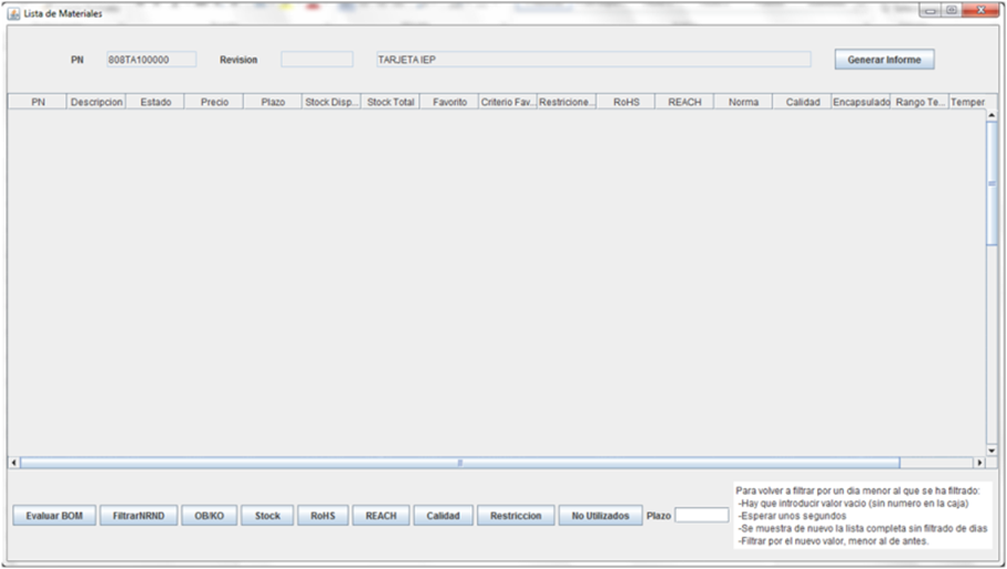 – Ventana principal (Filtros de evaluación). En la segunda parte es donde se analiza la gran mayora de datos e información adquiridos de los diferentes enlaces externos. El usuario puede interactuar con la aplicación usando filtros y botones, que facilitan el análisis de la BOM seleccionada.