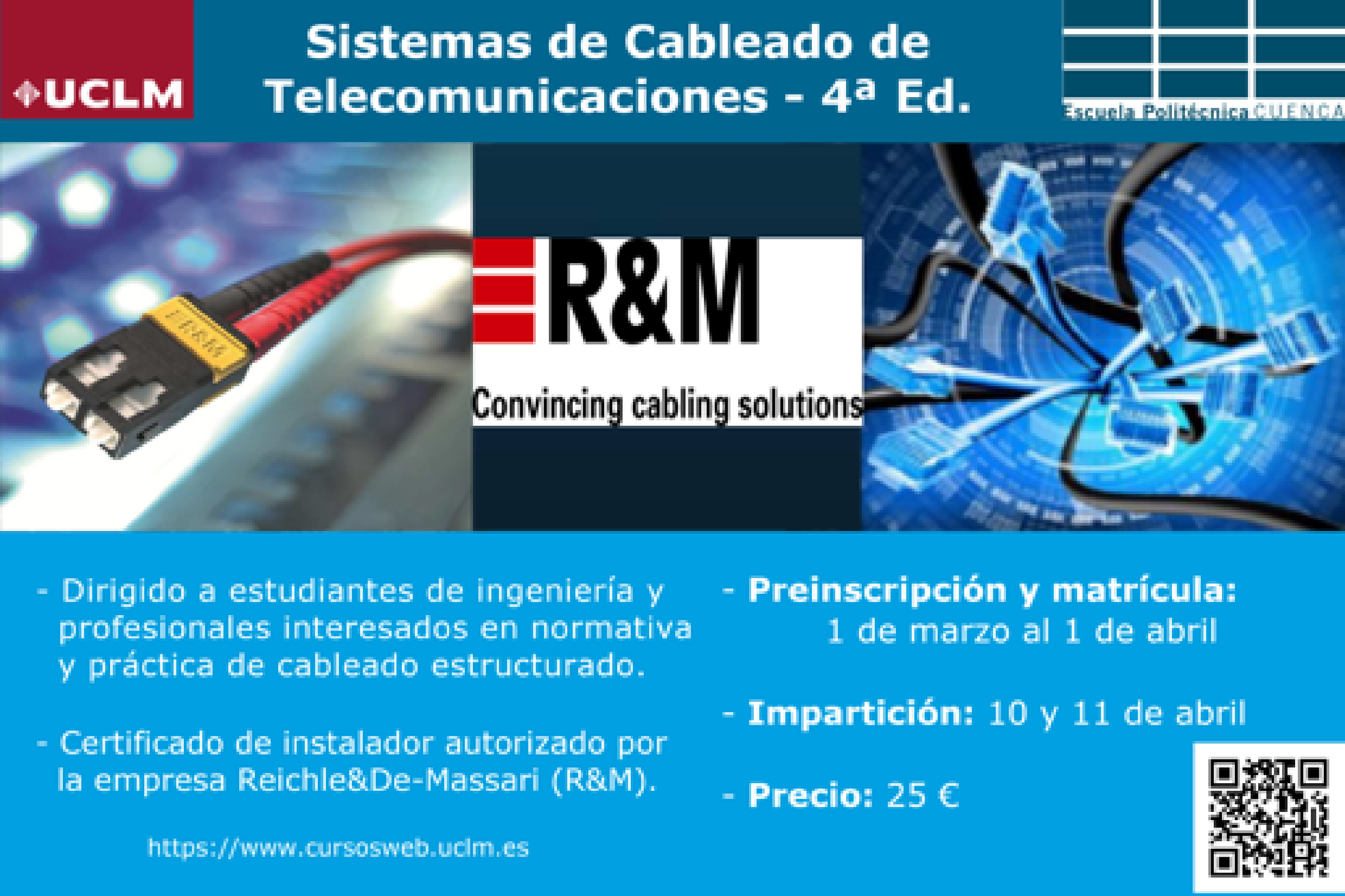 Este año se va a impartir la 4ª edición del curso de cableado estructurado R&M los días 10 y 11 de abril de 9 a 14h en la Escuela Politécnica. Los alumnos que lo realicen obtendrán un certificado de instalador autorizado por la empresa R&M.
