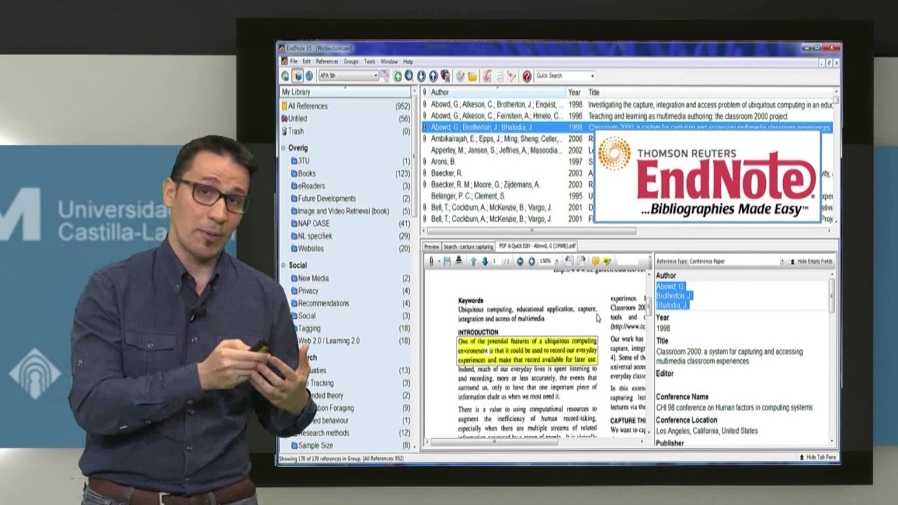 Las referencias bibliográficas son parte diaria del trabajo tanto de un estudiante de investigación como de un profesor y/o investigador. Su gestión automática mediante el uso de las TICs acelera tareas diarias tediosas como la redacción de tesis doctorales, trabajos fin de grado o máster, apuntes de cualquier tipo, la petición de proyectos o la elaboración de un curriculum vitae. La mayoría de las universidades dispone de acceso a gran parte de las principales bases de datos bibliográficas de carácter científico y docente como puede ser el portal Web of Science. Este portal web incluye acceso a herramientas de gestión bibliográfica como EndNote Web que aportan un gran potencial al docente investigador. Por lo tanto, es esencial el conocimiento y dominio de dichas herramientas para poder optimizar el tiempo dedicado a las labores docentes y/o investigadores. Así pues, el presente curso pretende dar una visión de las herramientas para facilitar la labor diaria de docente investigador, a través de sus principales funcionalidades.