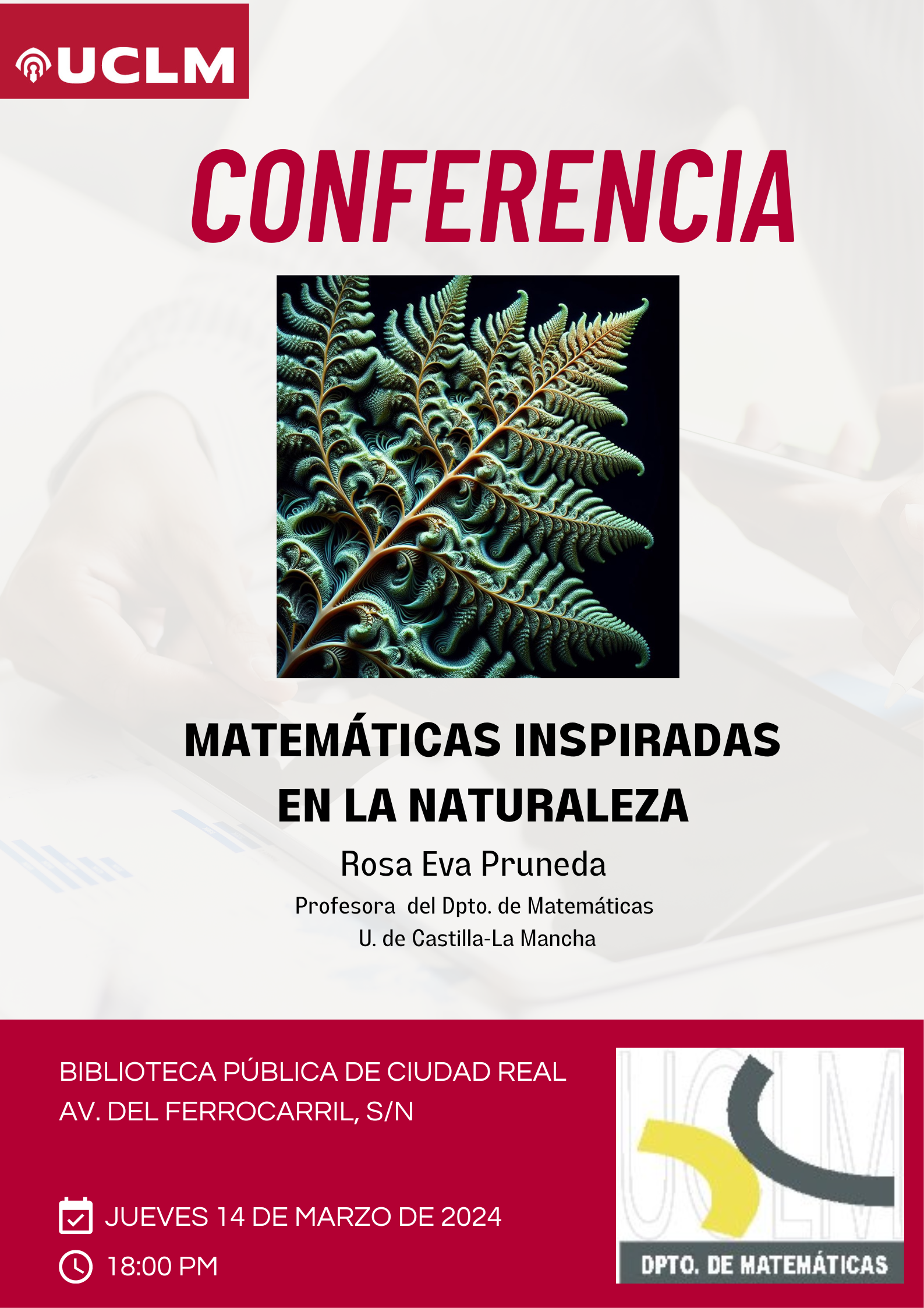 Nuestra compañera la profesora Rosa Eva Pruneda dará la charla divulgativa "Matemáticas inspiradas en la naturaleza" con motivo del día Pi, 14 de marzo, día internacional de las matemáticas, en la biblioteca pública de Ciudad Real.