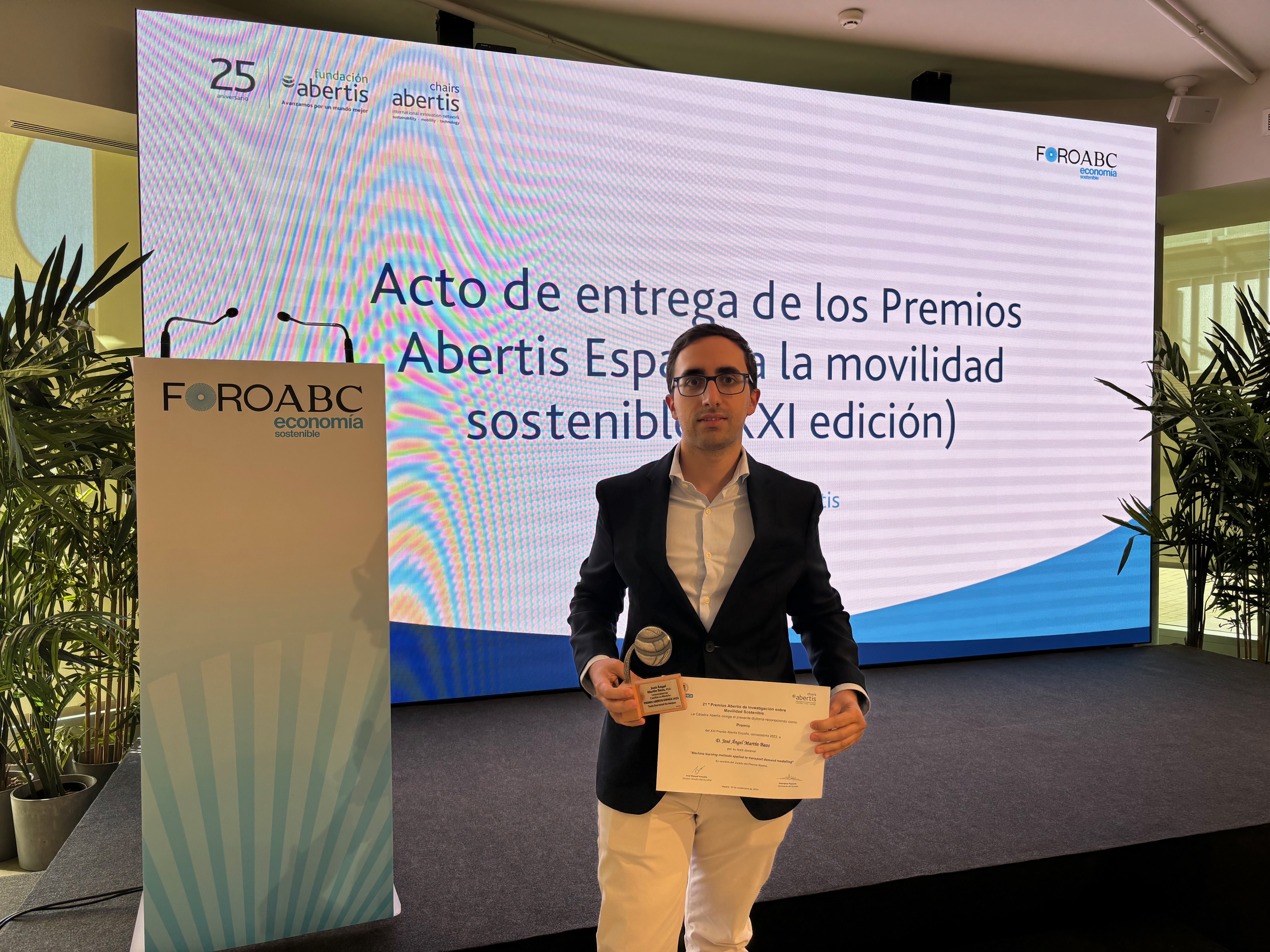 El profesor ha sido galardonado con el Premio Abertis España a la Movilidad Sostenible en su XXI edición. El premio reconoce el trabajo realizado en su tesis doctoral, la cual se centra en la aplicación de técnicas avanzadas de aprendizaje automático (ML) para optimizar la modelización de la demanda de transporte, un aspecto crucial para mejorar la movilidad sostenible y la planificación y gestión de infraestructuras de transporte.