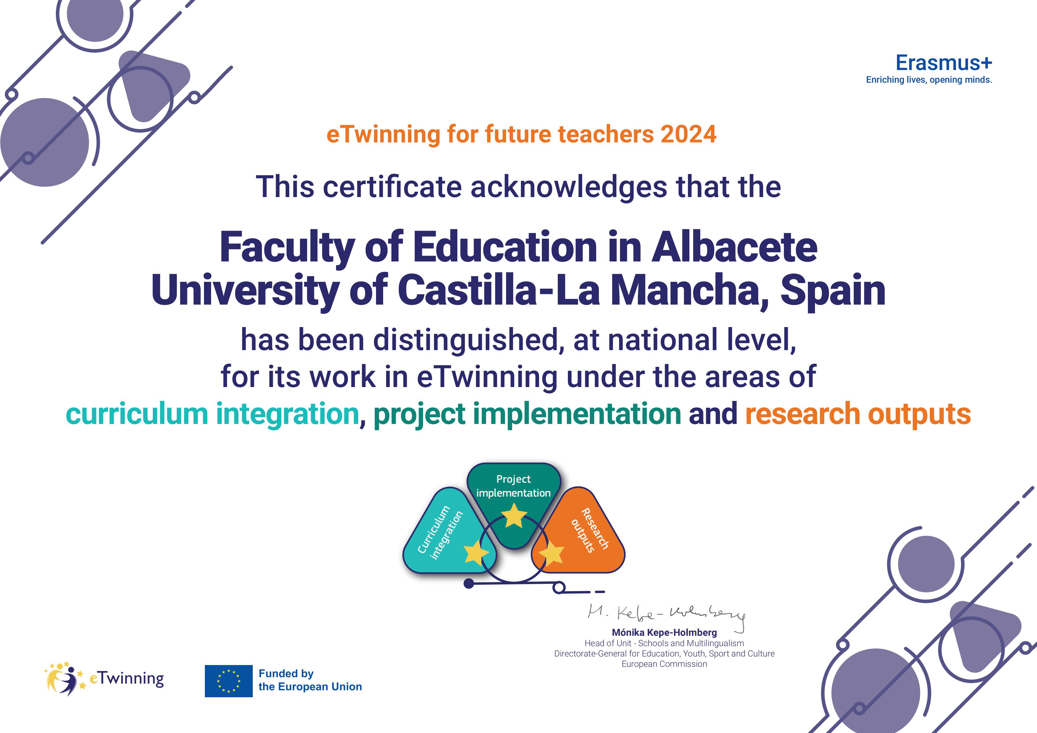Como fruto de sus resultados en las tres áreas evaluadas de integración curricular, implementación de proyectos y resultados de investigación, la Facultad de Educación de Albacete, ha sido finalista en las dos ocasiones hasta la fecha en las que se ha convocado el Premio Europeo a mejor ITE (Initial Teacher Education institutions). Además, es el único centro universitario español al que se le ha concedido el Sello Nacional eTwinning. Esto supone el reconocimiento a la labor liderada por nuestras compañeras, quienes también dinamizan el grupo nacional- eTwinning for Spanish Future Teachers- en dicha plataforma.