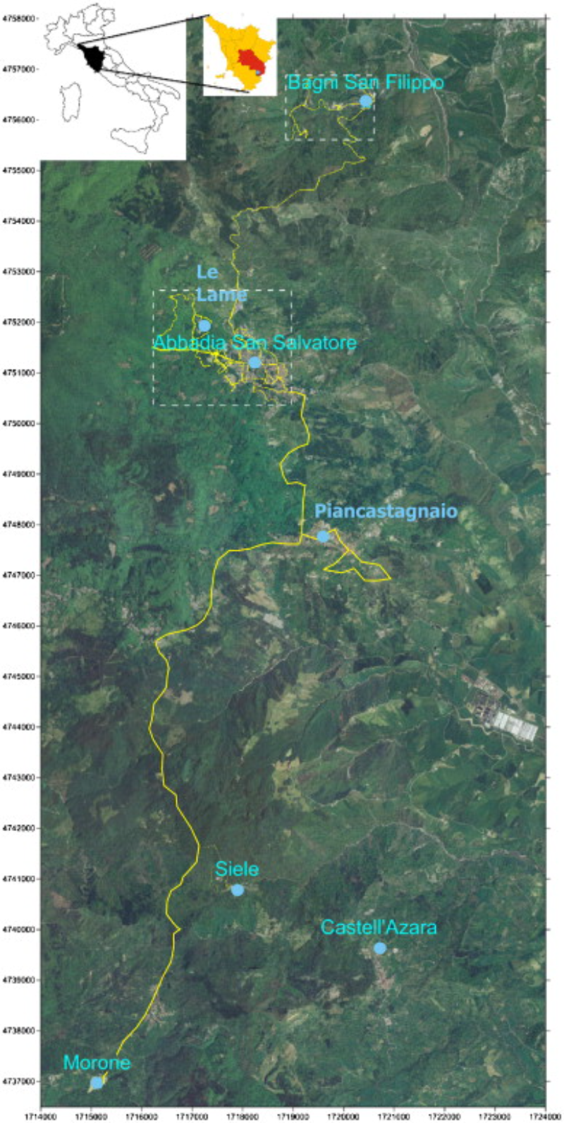 Localización del área de estudio. Los dos cuadrados blancos punteados son los sitios donde se encuentran, respectivamente, la antigua área minera de Abbadia San Salvatore y el sistema hidrotermal de Bagni San Filippo. Los caminos amarillos indican las carreteras donde se realizaron estudios rápidos de Hg atmosférico. (Para la interpretación de las referencias al color en la leyenda de esta figura, se remite al lector a la versión web de este artículo.)