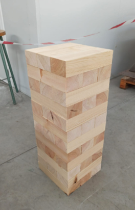 Se propone el clásico juego de la Jenga, pero al estilo de los ingenieros de caminos: ¡con grandes bloques de madera! La prueba consiste en construir una torre de bloques de madera de la mayor altura posible.