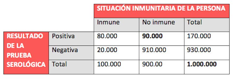 Resultados de la aplicación de una prueba serológica rápida de detección de infección por SARS-CoV-2.La prueba clasificaría como inmunes a 170.000 personas, de las que sólo 80.000 sería en realidad inmunes (menos de la mitad). Author provided