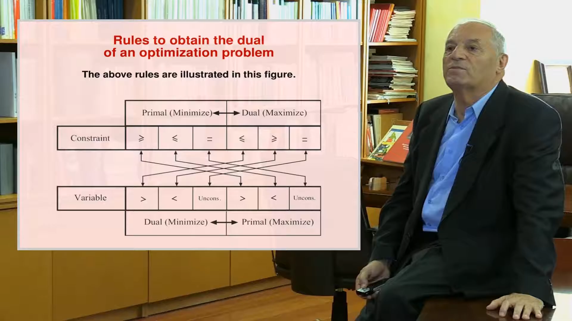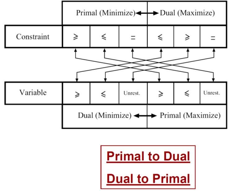 In this lesson we introduce the important concept of duality in mathematical programming, which will be the basic material for the sensitivity analysis of a later lesson. First we define dual program and show that any optimization problem has a dual and that the dual of the dual is the primal. Next, we show how to obtain the dual of a given problem and provide rules to do it. This rules are summarized graphically using the graphical scheme shown above this paragraph. We end with some illustrative examples that include the table manufacturing problem and the support vector machines problem.