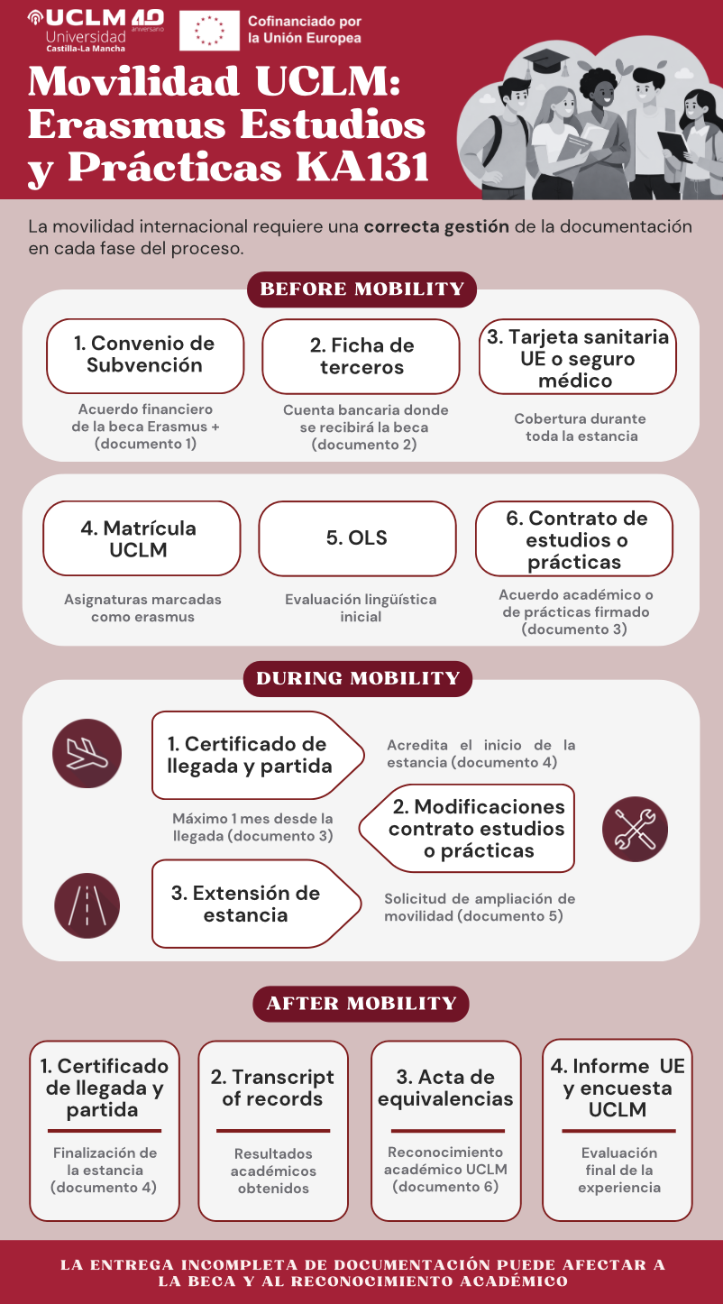 La Universidad de Castilla-La Mancha (UCLM) te ofrece un amplio abanico de posibilidades para completar tu formación en el extranjero bien en Europa bien en el resto del mundo. Los estudiantes pueden realizar parte de sus estudios en otra universidad europea bien realizando una estancia de estudios o una de prácticas dentro del programa Erasmus+.