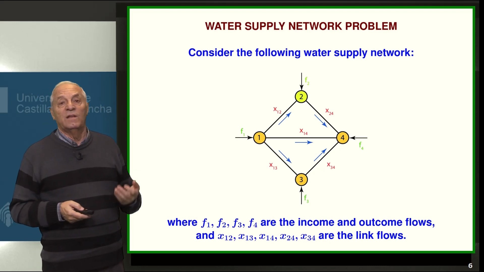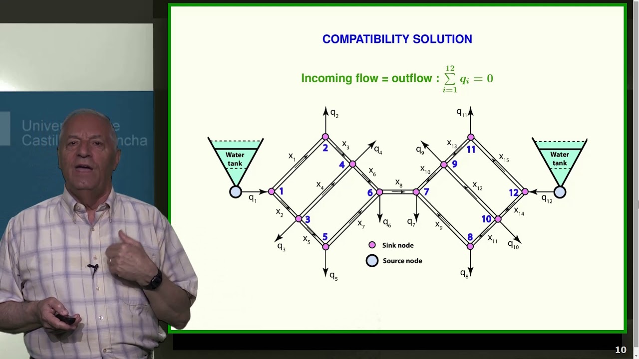In this lesson a real water supply network problem is analysed. First, we identify the unknowns and the equations and explain their physical and engineering meaning. Later, we write system of linear equations in matrix form, discussing the importance of the node and unknown numbering in the matrix banded structure. Next, we find that the compatibility condition is a flow balance equation. Finally, we find the general solution as the sum of a linear space with dimension equal to the numnber of holes in the network, which base can be immediately determined, and finally, a particular solution is obtained, so that, there is no need of a computer to find the gneral solution of the resulting system of linear equations.