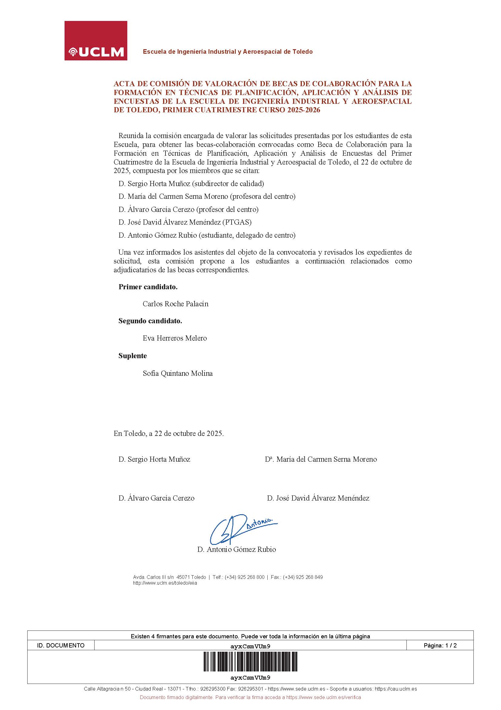 Acta de resolución de las becas colaboración en análisis de encuestas del primer cuatrimestre del curso 2025-26 de la Escuela de Ingeniería Industrial y Aeroespacial de Toledo,