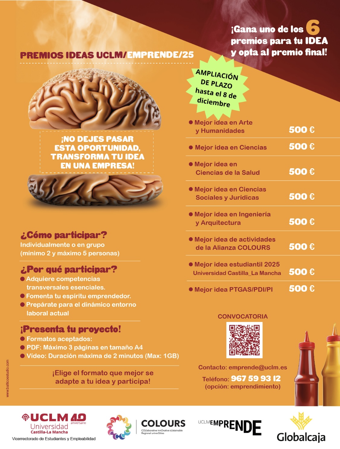 Está en marcha el II Concurso IDEAS - UCLMEMPRENDE/25 con 4.000 € en premios, habiéndose ampliado el plazo de presentación de solicitudes hasta las 23:59 h. del 8 de diciembre de 2025.