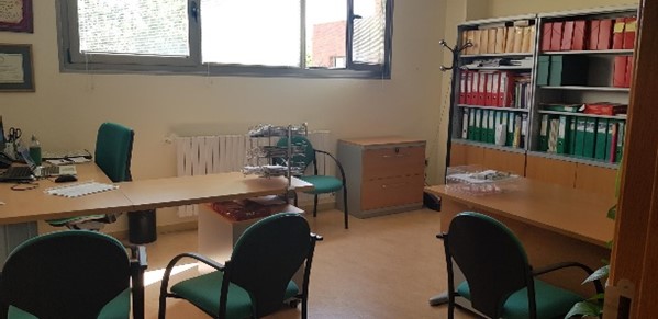 Compartido. Disponen de 2 mesas de trabajo, 2 mesas de recibimiento, 6 armarios, 2 ordenadores portátiles, 2 impresoras, 2 teléfonos. |